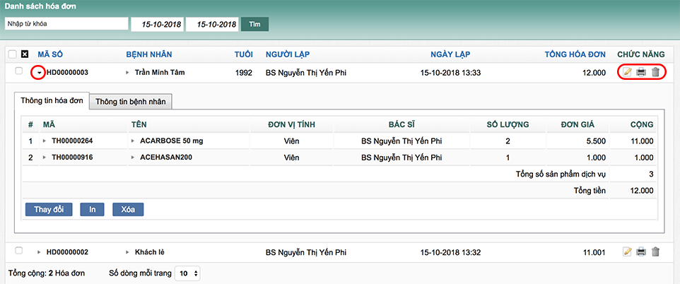Danh sách hóa đơn: người sử dụng có thể xem danh sách hóa đơn, lọc hóa đơn theo ngày, tìm kiếm hóa đơn, in hóa đơn, sửa hóa đơn