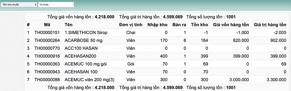 Thống kê thuốc tồn kho cho biết số lượng tồn kho của từng loại thuốc , cùng các thông tin về số lượng nhập vào, bán ra, giá vốn hàng tồn (giá trị hàng tồn dựa trên giá nhập) và giá trị hàng tồn (giá trị hàng tồn dựa trên giá bán). Thông tin tổng quan về kho: tổng giá vốn hàng tồn, tổng giá trị hàng tồn, tổng số lượng tồn.