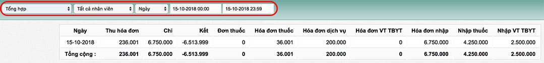 Thống kê tổng hợp tình hình thu chi của phòng khám trong khoảng thời gian hoặc ngày cụ thể. Có thể lựa chọn thống kê theo từng nhân viên